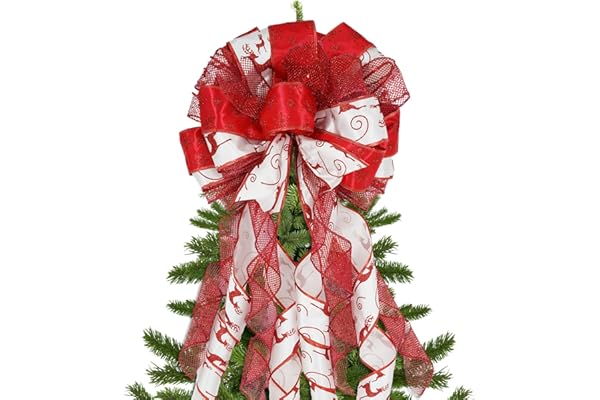 32x12 Inches Large Toppers Bow with Glitter Satin Mesh Streamer, Red Christmas Tree Topper for Christmas Home Decoration (Red)