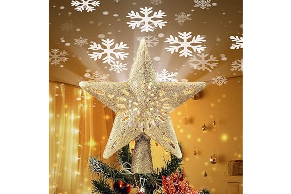 Christmas Star Tree Topper with Built-in Led Snowflake Projector Lights 10 Inch Hollowed Pentagram Tree Topper