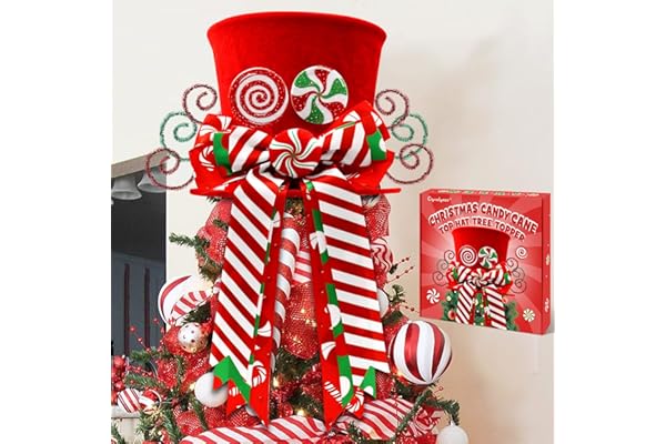 Christmas Candy Canes Tree Topper Red Hat with Peppermint Bows Ornament Winter Lollipop Holiday Home Decoration Xmas Festive Gift Ideas Supplies