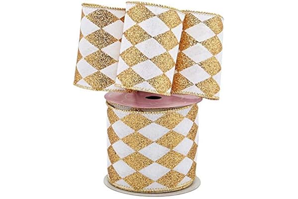 4" x 10 Yards, Argyle, Gold Wire Edged, Glitter, Christmas, Mardi Gras, Gift Wrapping, Wreath Decoration, Garland, Tree Topper Bow