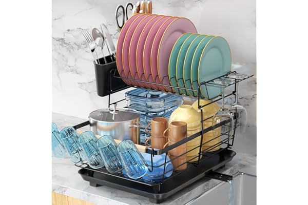 2 Tier Detachable Dish Rack and Drainboard Set, Rust-Proof Drying Rack for Kitchen Counter, Large Capacity Dish Drainer with Utensils Holder and Cup Rack, Black