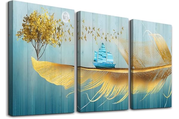 Canvas Wall Art for Living Room, Modern Pictures , Golden Feather and Yellow Tree Paintings, Posters for Farmhouse, Prints for Office, 3 Pieces Set