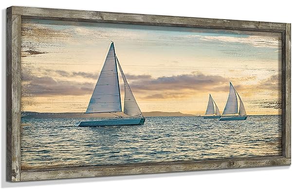 Ocean Framed Wooden Wall Art: Coastal Painting Art 40"x20" Sail Boats Artwork Decor Sunset Seascape Picture Prints for Office