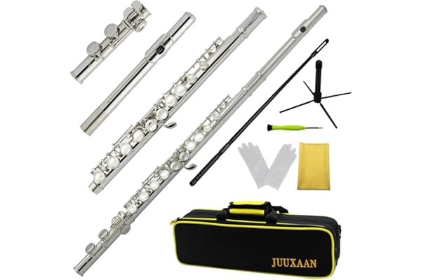 JUUXAAN Flute opening and closing hole C16 hole e key beginners play flute instruments with suitcase bracket gloves cleaning stick and rag (Nickel)