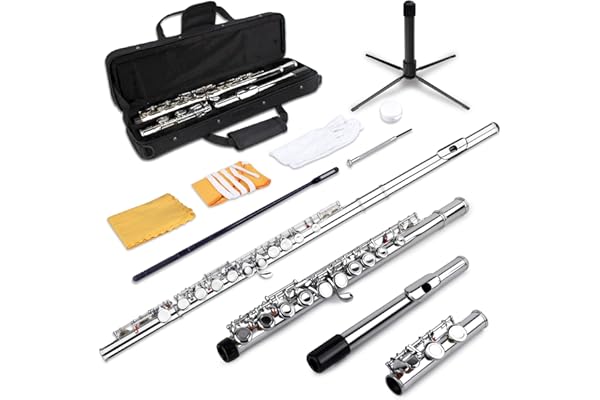 Tuning Rod, Stand, Carrying Case, Joint Grease and Cleaning Kit, 16 Key Student Flute Nickel plated flute, Beginner Flute in Band & Orchestra, Silver
