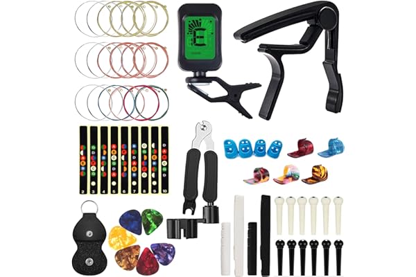 Tuner, Capo, 3-in-1 Restring Tool, Picks, Bridge Pins, Nuts & Saddles, Finger Protector, Finger Picks, Fretboard Stickers (Basic for beginners)
