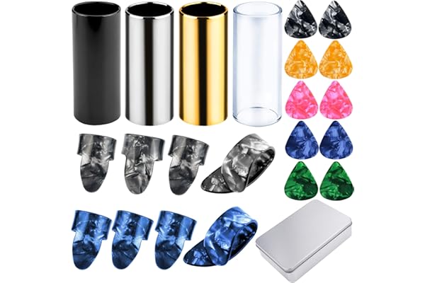 Augshy 4 Pieces Medium Guitar Slides(Include 3 Colors Stainless Steel, 1 Pieces Glass), 10 Pieces Guitar Picks and 8 Pieces Plastic Thumb & Finger Picks in Metal Box