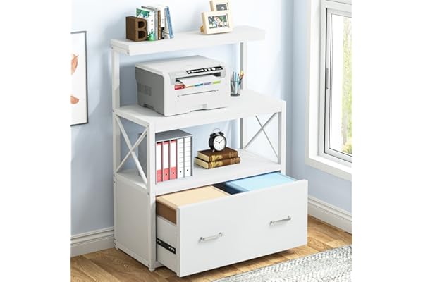 Mobile Lateral Filing Cabinet, Printer Stand with Open Storage Shelves for Home Office, White