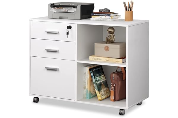 3 Drawer Mobile Lateral Filing Cabinet On Wheels, Printer Stand with Open Storage Shelves for Home Office(White)