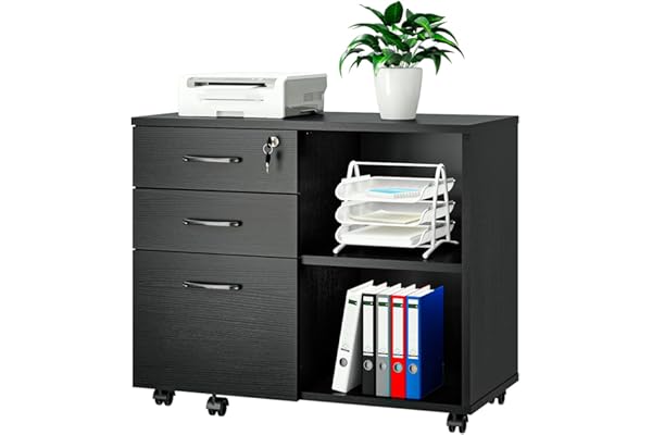 3 Drawer Mobile Lateral Filing Cabinet on Wheels, Printer Stand with Open Storage Shelves for Home Office (Black)