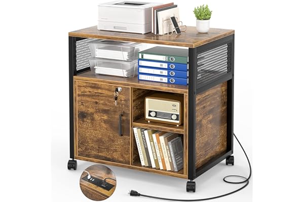 Locking Office Filing Cabinets with Socket and USB Charging Port, Modern Rolling Printer Stand with Storage for A4, Letter Size and File Folders, Rustic Brown