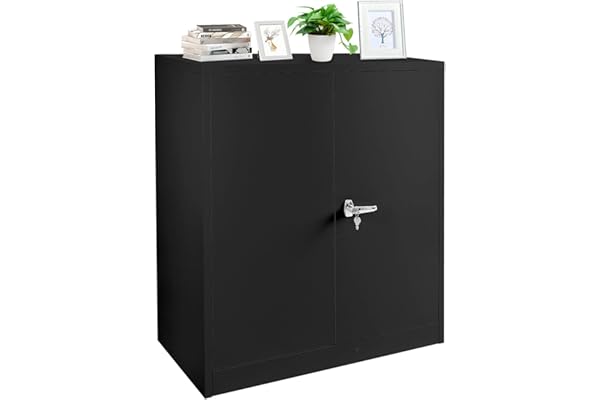 Lockable Steel Storage Cabinet with 2 Doors and Shelves, Black Metal Cabinet with Lock, Small Steel Cabinet for Office, Garage, Home, Shop INTERGREAT