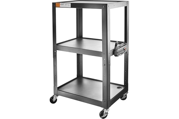TV, Laptop Computers, Printers, Metal Construction Rolling Storage Cart with Adjustable Shelves, 4 Wheels, 4 Outlets, 12ft Cord, Black