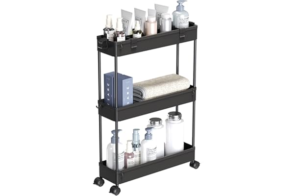 3 Tier Bathroom Rolling Utility Cart Storage Organizer Slide Out Cart, Mobile Shelving Unit Organizer Trolley for Office Bathroom Kitchen Laundry Room Narrow Places, Black