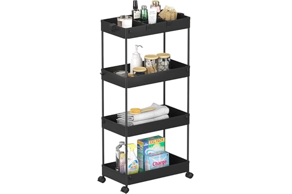 4 Tier Bathroom Rolling Utility Cart Storage Organizer Slide Out Cart, Mobile Shelving Unit Organizer Trolley for Office Bathroom Kitchen Laundry Room Narrow Places, Black