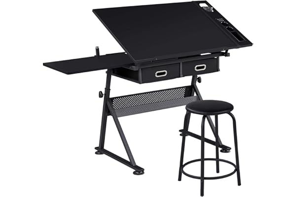 Height Adjustable Drawing Desk Art/Craft Desk Diamond Paintings Work Station w/ 2 Storage Drawers and Stool for Home Office School, Black