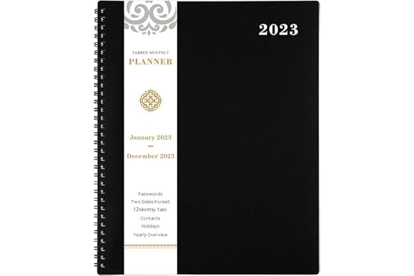 Monthly Planner 2023, 12-Month Planner with Tabs & Pocket & Label, Contacts and Passwords, 8.5" x 11", Thick Paper, Jan. 2023 - Dec. 2023, Twin-Wire Binding - Black by Artfan