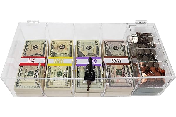 5 Compartment Cash Organizer Money Storage Box with Lockable Cover and Coin Tray Insert, 300 Currency Wrappers Included