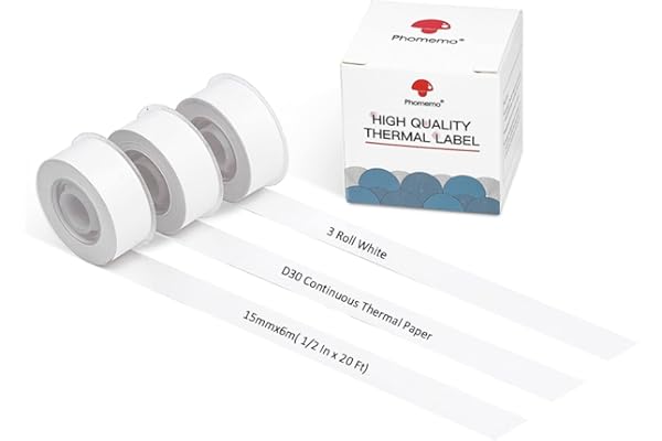 Phomemo 3 Roll D30 Adhesive White Continuous Thermal Label Paper 1/2 in X 20 Ft (15mm X 6m) Black on White