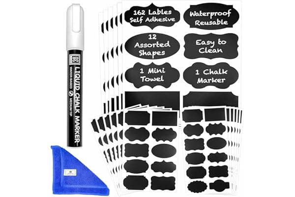 Washable, Removable & Reusable Labels for Jars with Free Erasable Liquid Chalk Marker & Mini Towel (Pack of 162)