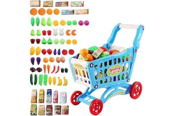 deAO Kids Shopping Cart Trolley Play Set Includes 78 Grocery Food Fruit Vegetables Shop Accessories (Blue)